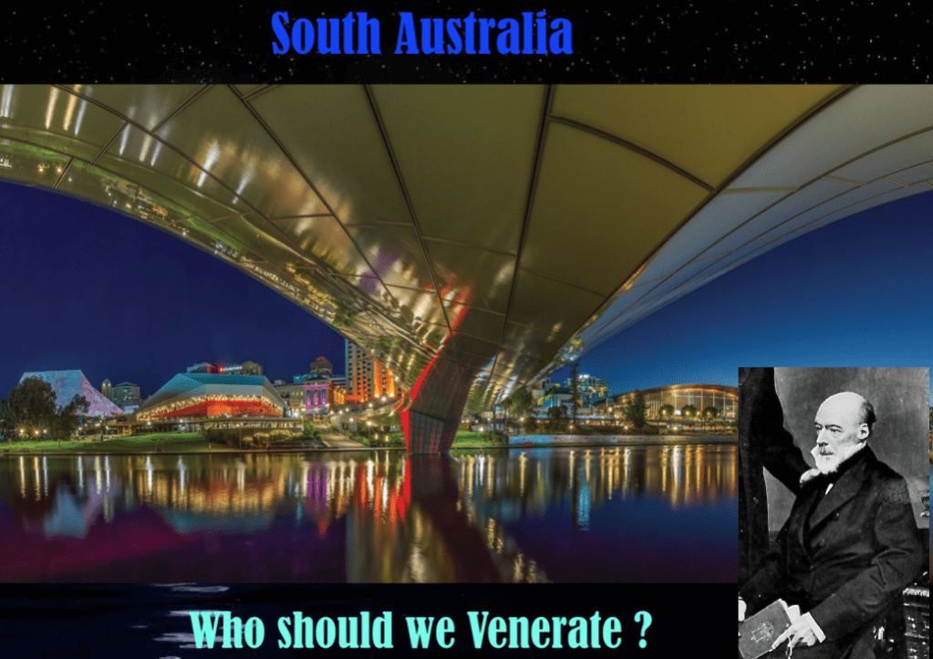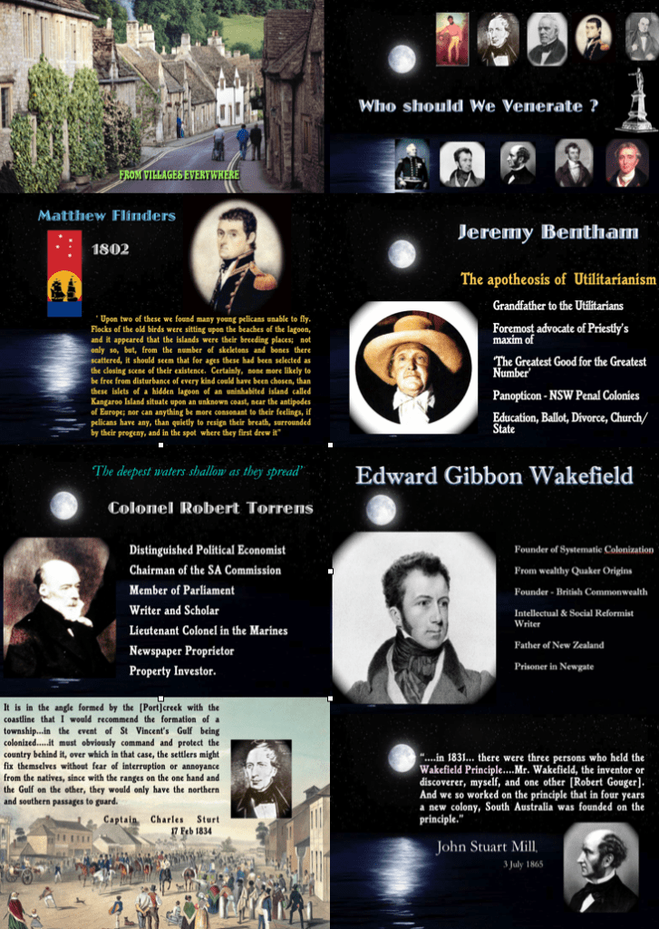 Unlike Captain Cook’s voyage to the Great South Land which was largely of a cartographic nature, coupled with a search for a remote locality to deposit Britain’s vagrants and petty criminals, the South Australian experiment was imbued with a healthy mix of capital investment and a disposition toward universal suffrage, republicanism, social reform and the separation of church and state. These were for the most part noble sentiments despite the myopia with respect to the local indigenous population. As to who today’s citizens should venerate (because many of them are still strangely undecided) there remains a deafening silence. That Is why I have offered up this second panel of slides from one of my public presentations which is provocatively entitled ‘Who should we venerate?’
