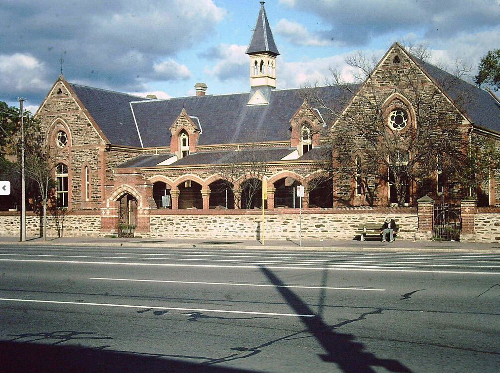 This school was the first of the kind built in the colony of South Australia. The building is of the pointed style, with gables and gablets. It is of one storey, and the height to the plate 19 feet 6 inches and 25 feet to the ceiling. Accommodation is provided for three distinct schools, to be apportioned respectively to boys, girls, and infants. The principle school-rooms – those for boys and girls – are each 70 feet by 24 feet in the clear, and the class-rooms which open out of each, are 24 feet by 16 feet. A hat and cloakroom and lavatory are also attached to each of these main divisions, the former being 26 feet by 12 feet and the latter by 24 feet by 8 feet. The Infant classroom, also provided with a hat and cloak room and lavatory of rather smaller size than those connected with the other departments, is 40 feet in length by 20 feet in breadth. For the convenience of the headmaster and matron, and their assistants, there are two rooms opening from the main lobby. Between the two large schoolrooms is an arcade, paved with a slate and roofed in a like manner as the other portions of the schools. This arcade has the effect of keeping the classrooms cool and is found convenient as a sheltered walk. Ventilation is secured by tubes from the ceiling to the external air, terminating at the Ridge of the roof. Fresh air is admitted by shaft’s opening just below the level of the plate. In the Infant School room the Gallery accommodates from 90 to 100 juveniles. In each of the larger rooms are five groups of desks and forms, 5 deep, right across the room, with a passage between the several groups the rooms are lighted by narrow pointed windows at the sides and at the ends of the large schoolrooms are coupled lights with cinquefoil openings over them. The turret is the centre of the roof, which rises to a height of 28 feet from the ridge, contains a bronze bell, 100 pounds in weight and of a sonorous tone. The land on which the buildings stand is enclosed with a substantial stone fence 5 feet 8 inches high, with brick coping and piers. The entrances to the schools are furnished with elegant wrought-iron gates. More than 3/4 of the acre are available for recreation purposes. There is a light iron fence between the respective parts appointed for the boys and girls and infants. The boys enter from Brown St and the girls an infants from Grove St. The number of scholars on the roll is 1,200 . The average attendance is 950